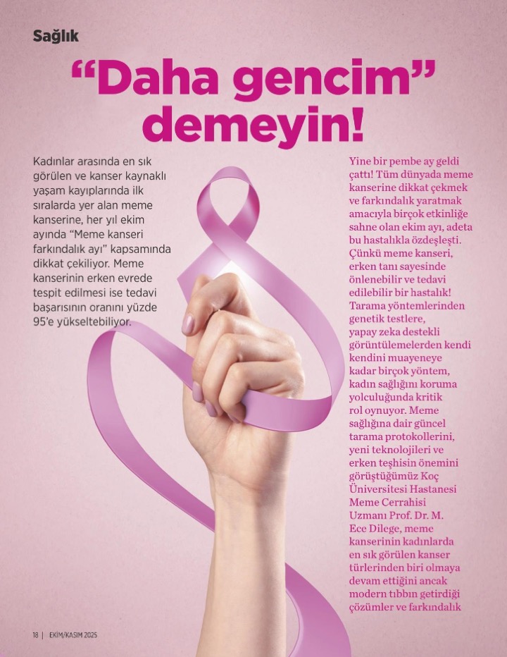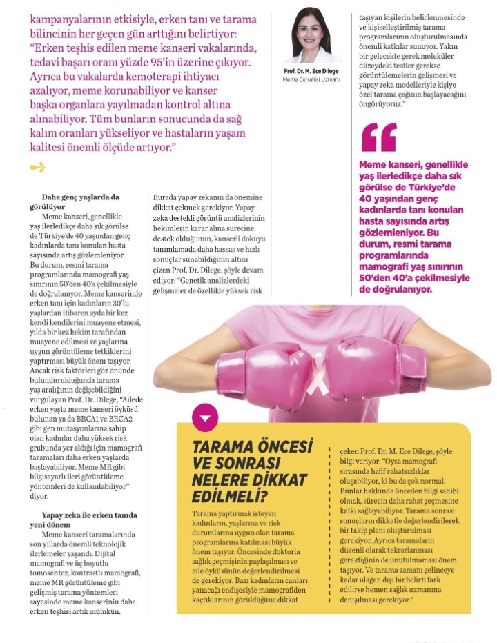 Meme sağlığına dair güncel tarama protokollerini, yeni teknolojileri ve erken teşhisin önemini görüştüğümüz Koç Üniversitesi Hastanesi Meme Cerrahisi Uzmanı Prof. Dr. M. Ece Dilege, meme kanserinin kadınlarda en sık görülen kanser türlerinden biri olmaya devam ettiğini ancak modern tıbbın getirdiği çözümler ve farkındalık kampanyaların etkisiyle, erken tanı ve tarama bilincinin her geçen gün arttığını belirtiyor: “Erken teşhis edilen meme kanseri vakalarında tedavi başarı oranı yüzde 95’in üzerine çıkıyor. Ayrıca bu vakalarda kemoterapi ihtiyacı azalıyor, meme korunabiliyor ve kanser başka organlara yayılmadan kontrol altına alınabiliyor. Tüm bunların sonucunda da sağ kalım oranları yükseliyor ve hastaların yaşam kalitesi önemli ölçüde artıyor.”